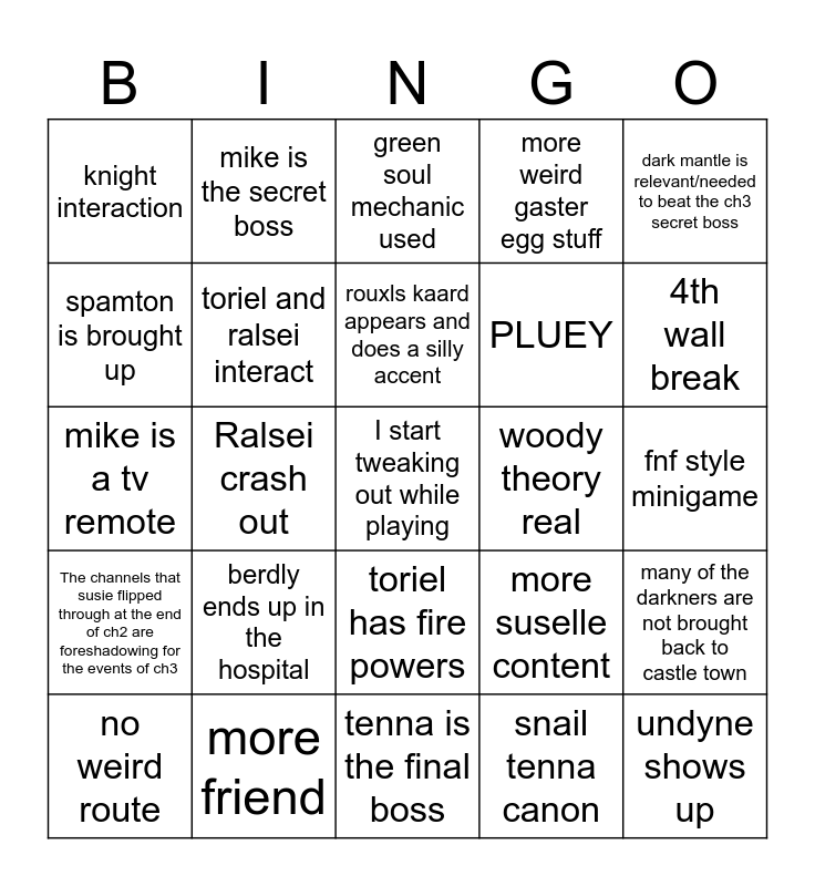 This bingo card has a free space and 24 words: berdly ends up in the hospital, more friend, rouxls kaard appears and does a silly accent, no weird route, dark mantle is relevant/needed to beat the ch3 secret boss, knight interaction, spamton is brought up, mike is the secret boss, woody theory real, toriel has fire powers, PLUEY, mike is a tv remote, more suselle content, many of the darkners are not brought back to castle town, toriel and ralsei interact, snail tenna canon, fnf style minigame, green soul mechanic used, 4th wall break, Ralsei crash out, undyne shows up, The channels that susie flipped through at the end of ch2 are foreshadowing for the events of ch3, more weird gaster egg stuff and tenna is the final boss.