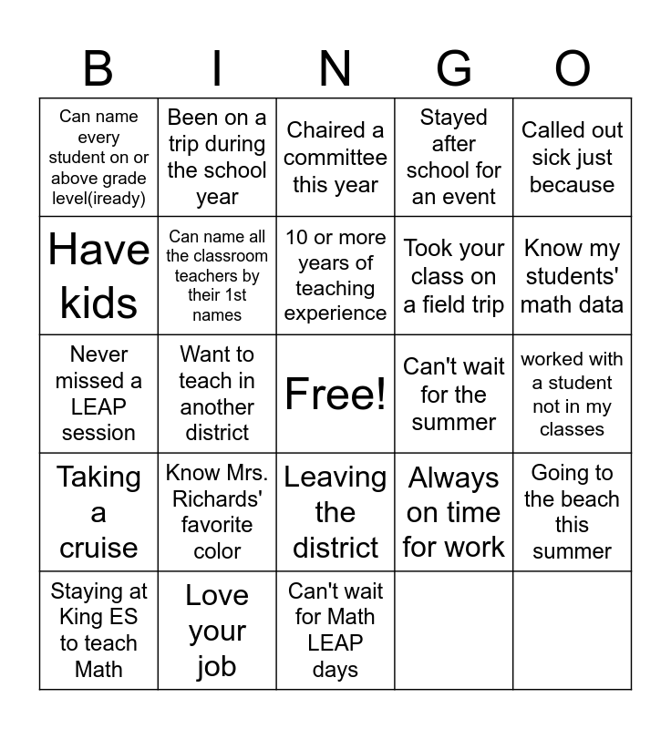 This bingo card has a free space and 26 words: Made a difference with a student, Love your job, Can't wait for Math LEAP days, Always on time for work, Know my students' math data, Can name every student on or above grade level(iready), Been on a trip during the school year, Chaired a committee this year, Stayed after school for an event, worked with a student not in my classes, Never missed a LEAP session, Want to teach in another district, Can't wait for the summer, Going to the beach this summer, Taking a cruise, Traveling out of the USA, 10 or more years of teaching experience, Took your class on a field trip, Called out sick just because, Staying at King ES to teach Math, Can name all the classroom teachers by their 1st names, Leaving the district, Will be bored over the summer, Know Mrs. Richards' favorite color, Have kids and I have a pet.