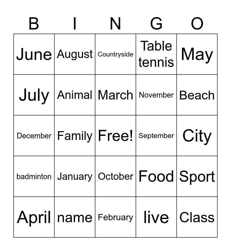 This bingo card has a free space and 25 words: January, February, March, April, May, June, July, August, September, October, November, December, Food, Sport, Animal, Color, City, Countryside, Beach, Family, Class, name, badminton, Table tennis and live.
