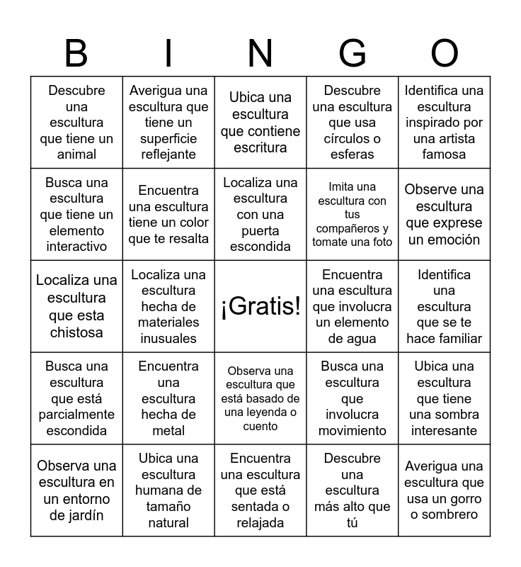 This bingo card has a free space and 24 words: Encuentra una escultura hecha de metal, Ubica una escultura humana de tamaño natural, Localiza una escultura con una puerta escondida, Observa una escultura en un entorno de jardín, Identifica una escultura inspirado por una artista famosa, Descubre una escultura que tiene un animal, Busca una escultura que tiene un elemento interactivo, Averigua una escultura que tiene un superficie reflejante, Encuentra una escultura que involucra un elemento de agua, Observa una escultura que está basado de una leyenda o cuento, Imita una escultura con tus compañeros y tomate una foto, Localiza una escultura que esta chistosa, Busca una escultura que involucra movimiento, Ubica una escultura que tiene una sombra interesante, Encuentra una escultura tiene un color que te resalta, Descubre una escultura más alto que tú, Identifica una escultura que se te hace familiar, Ubica una escultura que contiene escritura, Observe una escultura que exprese un emoción, Localiza una escultura hecha de materiales inusuales, Averigua una escultura que usa un gorro o sombrero, Busca una escultura que está parcialmente escondida, Descubre una escultura que usa círculos o esferas and Encuentra una escultura que está sentada o relajada.