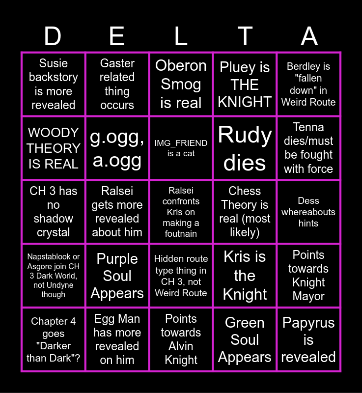 This bingo card has 25 words: Purple Soul Appears, Points towards Alvin Knight, IMG_FRIEND is a cat, Chapter 4 goes "Darker than Dark"?, Berdley is "fallen down" in Weird Route, Susie backstory is more revealed, WOODY THEORY IS REAL, Gaster related thing occurs, Chess Theory is real (most likely), Hidden route type thing in CH 3, not Weird Route, Rudy dies, CH 3 has no shadow crystal, Kris is the Knight, Points towards Knight Mayor, g.ogg, a.ogg, Papyrus is revealed, Dess whereabouts hints, Oberon Smog is real, Tenna dies/must be fought with force, Ralsei gets more revealed about him, Ralsei confronts Kris on making a foutnain, Egg Man has more revealed on him, Napstablook or Asgore join CH 3 Dark World, not Undyne though, Pluey is THE KNIGHT and Green Soul Appears.