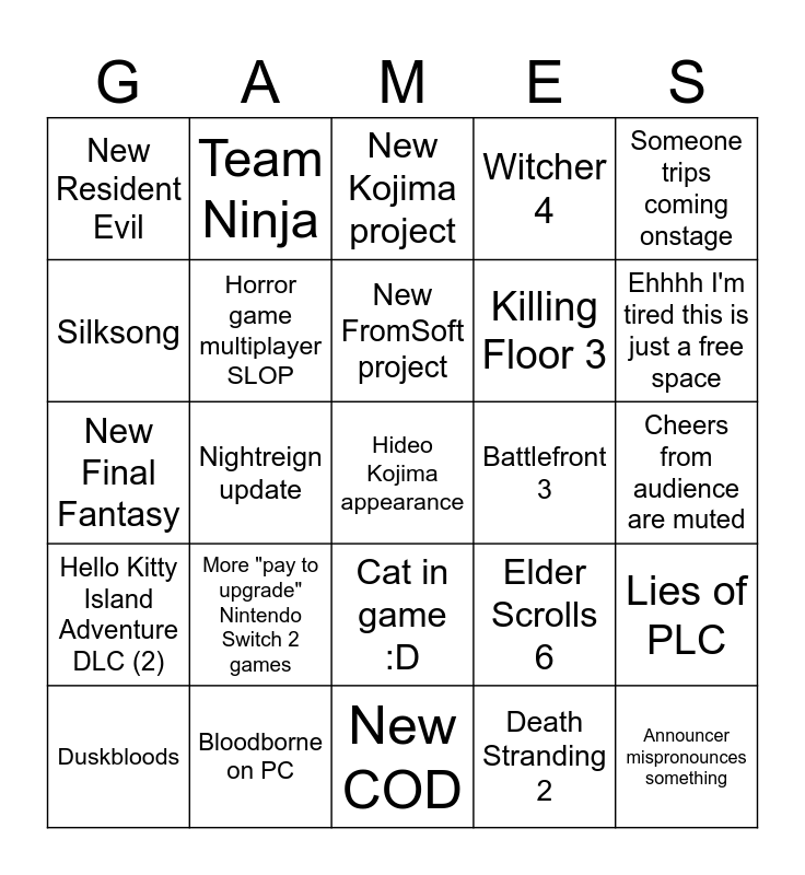 This bingo card has a free space and 24 words: More "pay to upgrade" Nintendo Switch 2 games, Bloodborne on PC, New FromSoft project, Duskbloods, Someone trips coming onstage, New Resident Evil, Silksong, Team Ninja, Battlefront 3, Cat in game :D, Killing Floor 3, New Final Fantasy, Elder Scrolls 6, Lies of PLC, Horror game multiplayer SLOP, Death Stranding 2, Cheers from audience are muted, New Kojima project, Ehhhh I'm tired this is just a free space, Nightreign update, Announcer mispronounces something, Hello Kitty Island Adventure DLC (2), Witcher 4 and New COD.