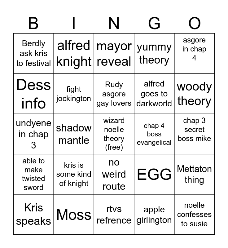 This bingo card has a free space and 24 words: Kris speaks, kris is some kind of knight, Rudy asgore gay lovers, apple girlington, asgore in chap 4, Berdly ask kris to festival, alfred knight, mayor reveal, chap 4 boss evangelical, chap 3 secret boss mike, undyene in chap 3, fight jockington, EGG, Mettaton thing, Dess info, Moss, rtvs refrence, yummy theory, woody theory, able to make twisted sword, shadow mantle, no weird route, alfred goes to darkworld and noelle confesses to susie.