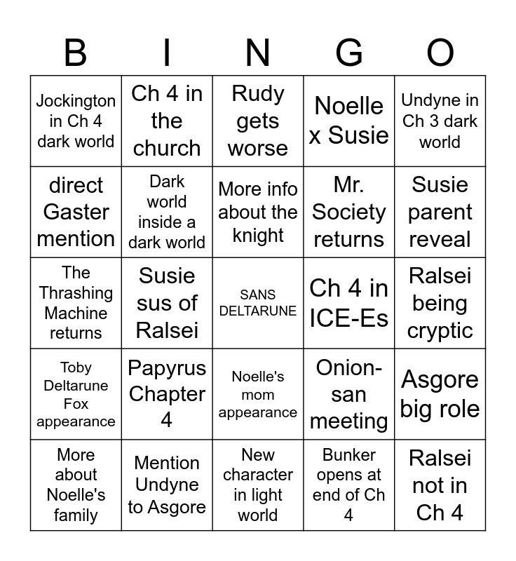 This bingo card has a free space and 24 words: Papyrus Chapter 4, Mention Undyne to Asgore, More info about the knight, More about Noelle's family, Undyne in Ch 3 dark world, Jockington in Ch 4 dark world, direct Gaster mention, Ch 4 in the church, Ch 4 in ICE-Es, Noelle's mom appearance, Mr. Society returns, The Thrashing Machine returns, Onion-san meeting, Asgore big role, Dark world inside a dark world, Bunker opens at end of Ch 4, Ralsei being cryptic, Rudy gets worse, Susie parent reveal, Susie sus of Ralsei, Ralsei not in Ch 4, Toby Deltarune Fox appearance, Noelle x Susie and New character in light world.