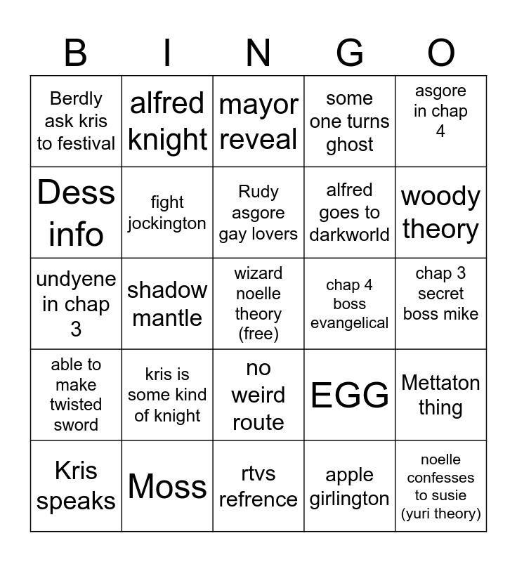 This bingo card has a free space and 24 words: Kris speaks, kris is some kind of knight, Rudy asgore gay lovers, apple girlington, asgore in chap 4, Berdly ask kris to festival, alfred knight, mayor reveal, chap 4 boss evangelical, chap 3 secret boss mike, undyene in chap 3, fight jockington, EGG, Mettaton thing, Dess info, Moss, rtvs refrence, some one turns ghost, woody theory, able to make twisted sword, shadow mantle, no weird route, alfred goes to darkworld and noelle confesses to susie (yuri theory).