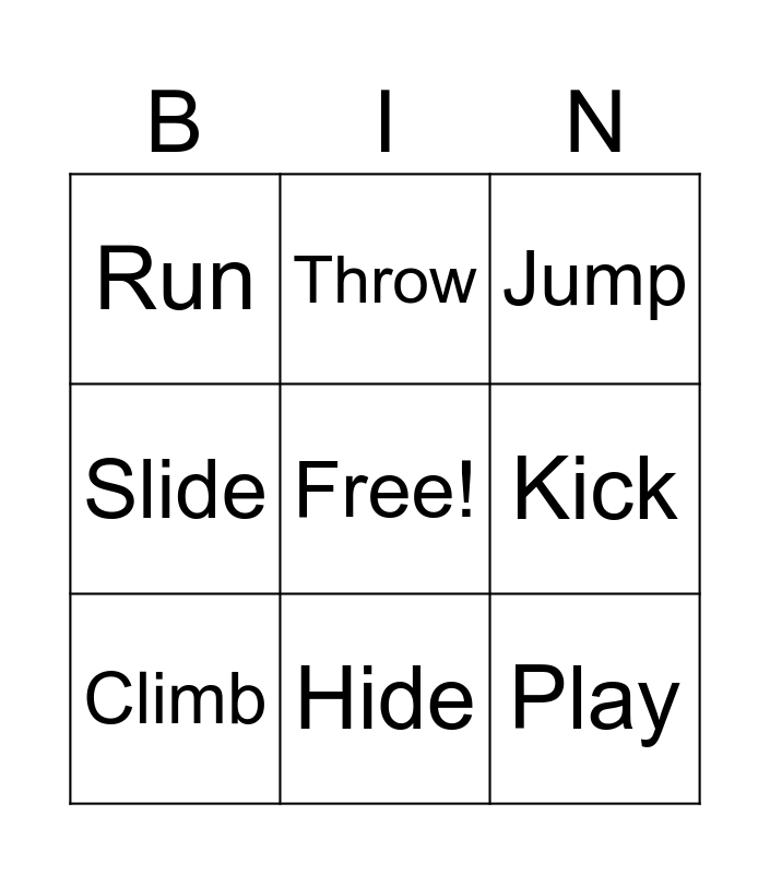 This bingo card has a free space and 30 words: Draw, Paint, Sing, Dance, Run, Jump, Climb, Swim, Read, Write, Color, Build, Ride, Skip, Hop, Laugh, Talk, Listen, Count, Play, Cook, Wash, Throw, Catch, Kick, Slide, Swing, Watch, Hide and Sing.