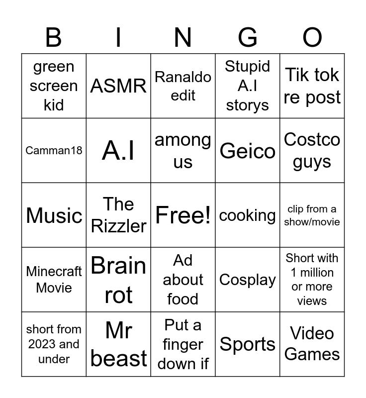 This bingo card has a free space and 24 words: Brain rot, Mr beast, among us, short from 2023 and under, Tik tok re post, green screen kid, Camman18, ASMR, cooking, Ad about food, Geico, Music, Cosplay, Short with 1 million or more views, A.I, Sports, clip from a show/movie, Ranaldo edit, Costco guys, The Rizzler, Video Games, Minecraft Movie, Stupid A.I storys and Put a finger down if.
