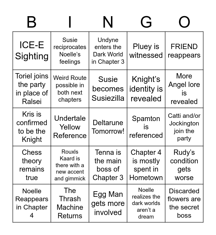 This bingo card has a free space and 24 words: Rouxls Kaard is there with a new accent and gimmick, The Thrash Machine Returns, Susie becomes Susiezilla, Noelle Reappears in Chapter 4, FRIEND reappears, ICE-E Sighting, Toriel joins the party in place of Ralsei, Susie reciprocates Noelle’s feelings, Spamton is referenced, Tenna is the main boss of Chapter 3, Knight’s identity is revealed, Kris is confirmed to be the Knight, Chapter 4 is mostly spent in Hometown, Rudy’s condition gets worse, Weird Route possible in both next chapters, Noelle realizes the dark worlds aren’t a dream, Catti and/or Jockington join the party, Undyne enters the Dark World in Chapter 3, More Angel lore is revealed, Undertale Yellow Reference, Discarded flowers are the secret boss, Chess theory remains true, Pluey is witnessed and Egg Man gets more involved.