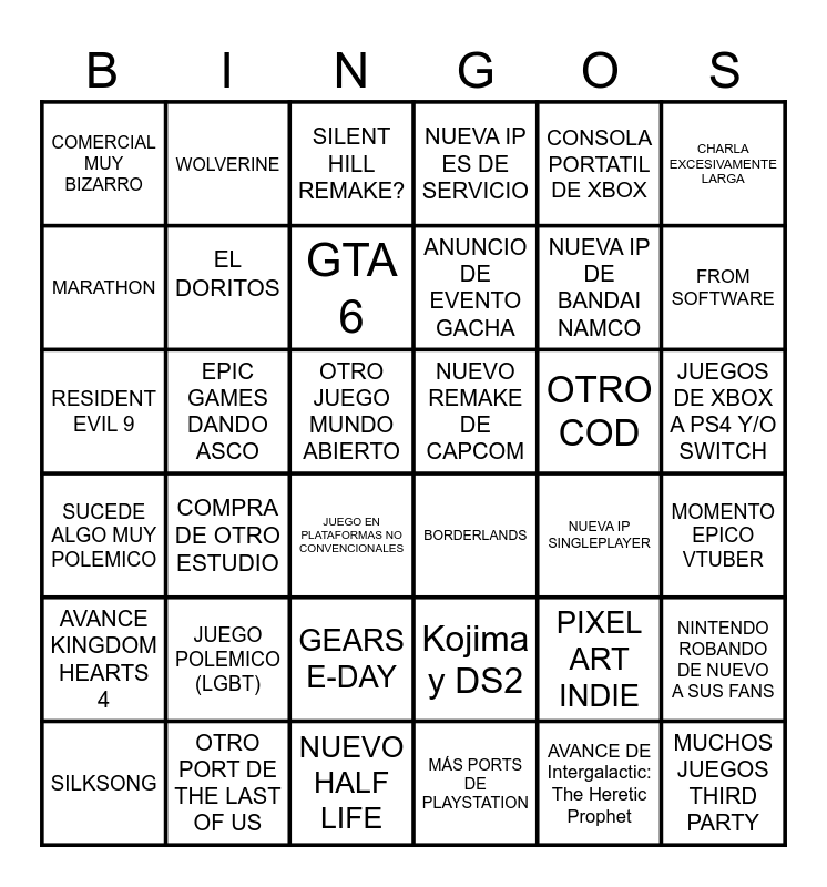 This bingo card has 36 words: Kojima y DS2, GEARS E-DAY, MÁS PORTS DE PLAYSTATION, MARATHON, SUCEDE ALGO MUY POLEMICO, NUEVO REMAKE DE CAPCOM, EL DORITOS, NUEVO HALF LIFE, CONSOLA PORTATIL DE XBOX, PIXEL ART INDIE, FROM SOFTWARE, NUEVA IP ES DE SERVICIO, NINTENDO ROBANDO DE NUEVO A SUS FANS, EPIC GAMES DANDO ASCO, ANUNCIO DE EVENTO GACHA, COMERCIAL MUY BIZARRO, AVANCE KINGDOM HEARTS 4, OTRO COD, RESIDENT EVIL 9, SILENT HILL REMAKE?, OTRO JUEGO MUNDO ABIERTO, COMPRA DE OTRO ESTUDIO, BORDERLANDS, JUEGO EN PLATAFORMAS NO CONVENCIONALES, NUEVA IP SINGLEPLAYER, WOLVERINE, NUEVA IP DE BANDAI NAMCO, OTRO PORT DE THE LAST OF US, GTA 6, CHARLA EXCESIVAMENTE LARGA, MUCHOS JUEGOS THIRD PARTY, SILKSONG, MOMENTO EPICO VTUBER, JUEGOS DE XBOX A PS4 Y/O SWITCH, JUEGO POLEMICO (LGBT) and AVANCE DE Intergalactic: The Heretic Prophet.