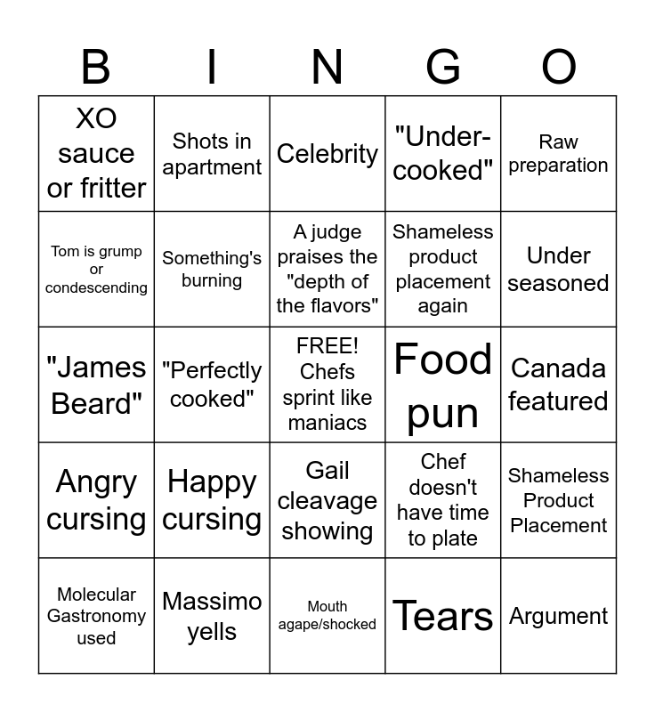 This bingo card has a free space and 24 words: Happy cursing, Massimo yells, A judge praises the "depth of the flavors", Molecular Gastronomy used, Raw preparation, XO sauce or fritter, Tom is grump or condescending, Shots in apartment, Food pun, Gail cleavage showing, Shameless product placement again, "James Beard", Chef doesn't have time to plate, Shameless Product Placement, Something's burning, Tears, Canada featured, Celebrity, Under seasoned, "Perfectly cooked", Argument, Angry cursing, "Under-cooked" and Mouth agape/shocked.