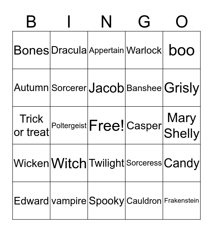 This bingo card has a free space and 24 words: Witch, vampire, Jacob, Edward, boo, Bones, Autumn, Dracula, Casper, Twilight, Banshee, Trick or treat, Sorceress, Candy, Sorcerer, Cauldron, Mary Shelly, Appertain, Grisly, Poltergeist, Frakenstein, Wicken, Warlock and Spooky.
