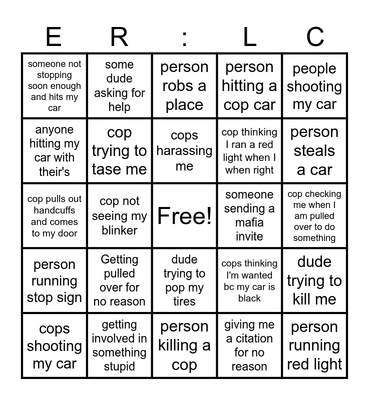 This bingo card has a free space and 24 words: Getting pulled over for no reason, getting involved in something stupid, cops harassing me, cops shooting my car, people shooting my car, someone not stopping soon enough and hits my car, anyone hitting my car with their's, some dude asking for help, someone sending a mafia invite, dude trying to pop my tires, cop thinking I ran a red light when I when right, cop pulls out handcuffs and comes to my door, cops thinking I'm wanted bc my car is black, dude trying to kill me, cop trying to tase me, giving me a citation for no reason, cop checking me when I am pulled over to do something, person robs a place, person steals a car, cop not seeing my blinker, person running red light, person running stop sign, person hitting a cop car and person killing a cop.