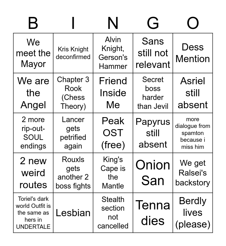 This bingo card has a free space and 24 words: Rouxls gets another 2 boss fights, Lesbian, Friend Inside Me, Toriel's dark world Outfit is the same as hers in UNDERTALE, Dess Mention, We meet the Mayor, We are the Angel, Kris Knight deconfirmed, Papyrus still absent, King's Cape is the Mantle, Secret boss harder than Jevil, 2 more rip-out-SOUL endings, Onion San, We get Ralsei's backstory, Chapter 3 Rook (Chess Theory), Tenna dies, more dialogue from spamton because i miss him, Alvin Knight, Gerson's Hammer, Asriel still absent, Lancer gets petrified again, Berdly lives (please), 2 new weird routes, Sans still not relevant and Stealth section not cancelled.