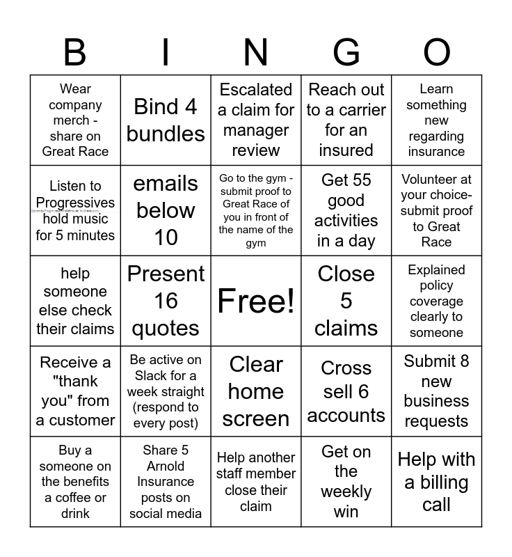 This bingo card has 1 images, a free space and 24 words: Be active on Slack for a week straight (respond to every post), Share 5 Arnold Insurance posts on social media, Go to the gym - submit proof to Great Race of you in front of the name of the gym, Buy a someone on the benefits a coffee or drink, Learn something new regarding insurance, Wear company merch - share on Great Race, Listen to Progressives hold music for 5 minutes, Bind 4 bundles, Close 5 claims, Clear home screen, Get 55 good activities in a day, help someone else check their claims, Cross sell 6 accounts, Submit 8 new business requests, emails below 10, Get on the weekly win, Explained policy coverage clearly to someone, Escalated a claim for manager review, Volunteer at your choice- submit proof to Great Race, Present 16 quotes, Help with a billing call, Receive a "thank you" from a customer, Reach out to a carrier for an insured and Help another staff member close their claim.