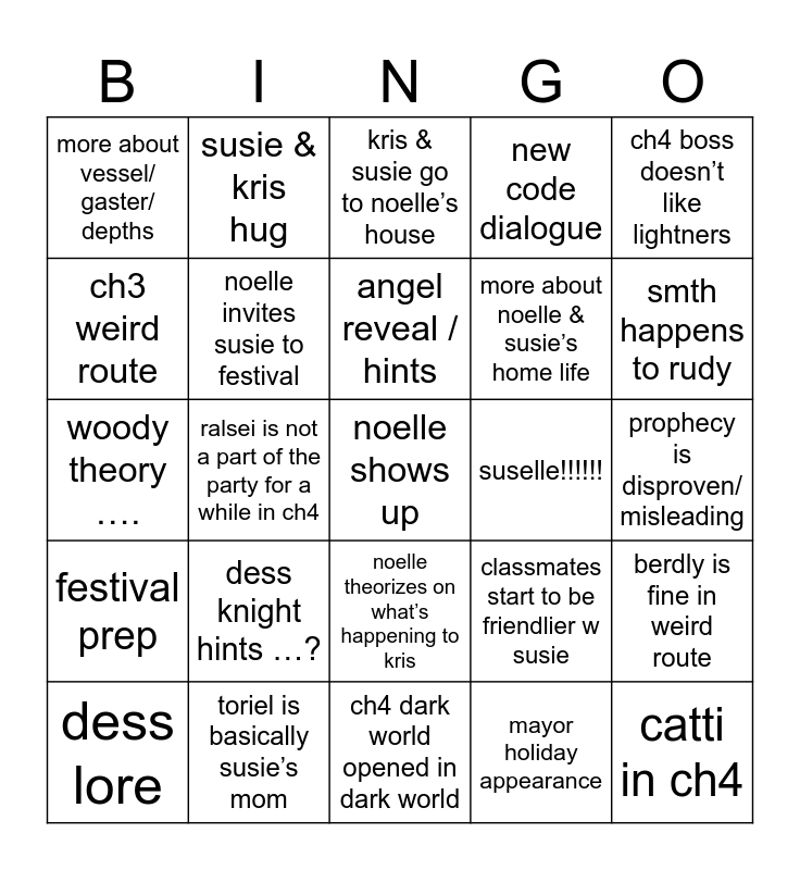 This bingo card has a free space and 24 words: dess knight hints …?, toriel is basically susie’s mom, angel reveal / hints, dess lore, ch4 boss doesn’t like lightners, more about vessel/ gaster/ depths, ch3 weird route, susie & kris hug, suselle!!!!!!, noelle theorizes on what’s happening to kris, more about noelle & susie’s home life, woody theory …., classmates start to be friendlier w susie, berdly is fine in weird route, noelle invites susie to festival, mayor holiday appearance, prophecy is disproven/ misleading, kris & susie go to noelle’s house, smth happens to rudy, ralsei is not a part of the party for a while in ch4, catti in ch4, festival prep, new code dialogue and ch4 dark world opened in dark world.