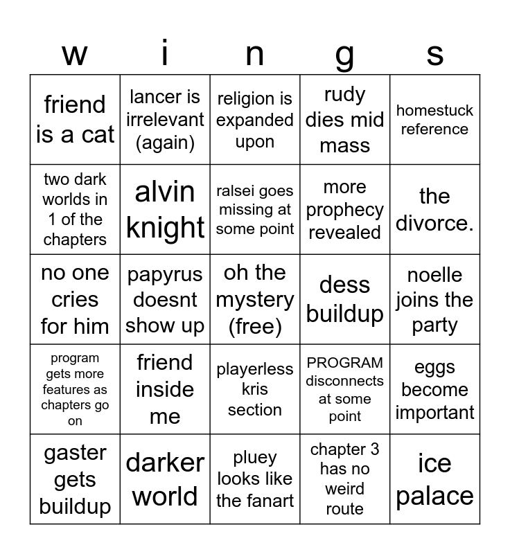 This bingo card has a free space and 24 words: friend inside me, darker world, ralsei goes missing at some point, gaster gets buildup, homestuck reference, friend is a cat, two dark worlds in 1 of the chapters, lancer is irrelevant (again), dess buildup, playerless kris section, more prophecy revealed, no one cries for him, PROGRAM disconnects at some point, eggs become important, alvin knight, chapter 3 has no weird route, noelle joins the party, religion is expanded upon, the divorce., papyrus doesnt show up, ice palace, program gets more features as chapters go on, rudy dies mid mass and pluey looks like the fanart.