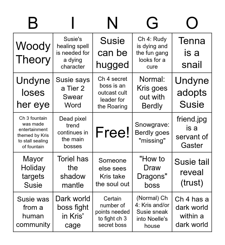 This bingo card has a free space and 24 words: Toriel has the shadow mantle, Dark world boss fight in Kris' cage, Ch 4 secret boss is an outcast cult leader for the Roaring, Susie was from a human community, Tenna is a snail, Woody Theory, Undyne loses her eye, Susie's healing spell is needed for a dying character, Snowgrave: Berdly goes "missing", Someone else sees Kris take the soul out, Normal: Kris goes out with Berdly, Ch 3 fountain was made entertainment themed by Kris to stall sealing of fountain, "How to Draw Dragons" boss, Susie tail reveal (trust), Susie says a Tier 2 Swear Word, (Normal) Ch 4: Kris and/or Susie sneak into Noelle's house, friend.jpg is a servant of Gaster, Susie can be hugged, Undyne adopts Susie, Dead pixel trend continues in the main bosses, Ch 4 has a dark world within a dark world, Mayor Holiday targets Susie, Ch 4: Rudy is dying and the fun gang looks for a cure and Certain number of points needed to fight ch 3 secret boss.
