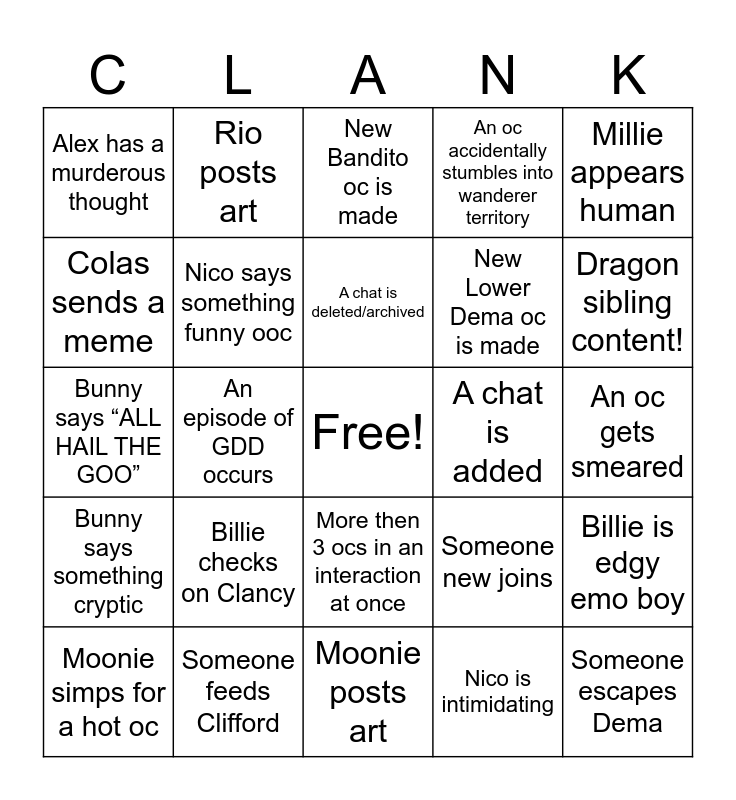 This bingo card has a free space and 73 words: Alex has a murderous thought, Oc dies :(, Alex has a murderous thought, Oc dies, Captive oc is made, Aizen makes an oc, Bunny says something cryptic, Someone accidentally uses the wrong bot, Someone new joins, Enchantresses are mean to someone, Zinnia plays fetch with Circe, Thalia is reckless, Nico says something funny ooc, An oc gets smeared, PUBLIC EXECUTION, Rio posts art, Moonie posts art, Colas sends a meme, Kat speaks french, A chat is added, A chat is deleted/archived, An oc accidentally stumbles into wanderer territory, Millie appears human, Sulien becomes human, Moonie simps for a hot oc, Mikeal blows something up, Moonie makes a REALLY cute but really traumatized lil oc, Someone mentions cannibalism unprompted, Someone makes an animal oc, An oc makes a sudden return after being inactive for over a week, Someone feeds Clifford, ANGST, Kiss scene :), An oc’s life is threatened, An episode of GDD occurs, An oc gets STABBED, An oc gets traumatized DEEPLY, Something gruesome happens, Someone escapes Dema, Nico makes a public appearance, Nico is intimidating, Billie checks on Clancy, Someone nearly dies but miraculously lives, Something happens that makes no logical sense, New Upper Dema oc is made, New Lower Dema oc is made, New Bandito oc is made, Indie is stressin/scared, Octo sends that Glinda gif unprompted, Bunny says “ALL HAIL THE GOO”, LonelyFoxo speaks, Someone sends a blurry picture, Mara x Reyes content, Alaric x Alex content, Clarence sibling content, Thalia officially decides between Birch and Zinnia, Zinnia and Thalia angst, More then 3 ocs in an interaction at once, Creature Feature EATS someone, Someone makes an oc that is LGB!, Someone makes an oc with a visible scar, Someone makes an oc that is below 5ft tall, Someone makes an oc that is above 7ft tall, Dragon sibling content!, Yelling match between ocs, Genuine wholesomeness between ocs, Platonic oc hug!, More than 3 people respond to a daily oc question, Billie is edgy emo boy, Someone leaves, Bunny mentions twenty one pilots, Zilly sends 3 raccoon gifs in one day and Vance ROID RAGES RAHHH.