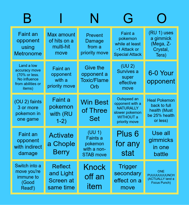 This bingo card has a free space and 24 words: Activate a Chople Berry, Reflect and Light Screen at same time, Give the opponent a Toxic/Flame Orb, Switch into a move you're immune to (Good Read!), (RU 1) uses a gimmick (Mega, Z-Crystal, Tera), Faint an opponent using Metronome, Land a low accuracy move (70% or less. No influence from abilities or items), Max amount of hits on a multi-hit move, Outspeed an opponent with a NATURALLY slower pokemon WITHOUT a priority move, (UU 1) Faints a pokemon with a non-STAB move, (UU 2) Survives a super effective move, (OU 2) faints 3 or more pokemon in one game, Plus 6 for any stat, Use all gimmicks in one battle, Faint an opponent with a priority move, Trigger secondary effect on a move, Heal Pokemon back to full health (Must be 25% health or less), Prevent Damage from a priority move, 6-0 Your opponent, Faint a pokemon with (RU 1-2), ONE PUUUUUUUUNCH (ACTUALLY land a Focus Punch), Faint an opponent with indirect damage, Faint a pokemon while at least -1 Attack or Special Attack and Knock off an item.