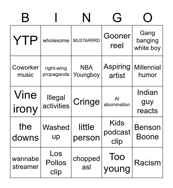This bingo card has a free space and 24 words: Washed up, Los Pollos clip, NBA Youngboy, wannabe streamer, Gang banging white boy, YTP, Coworker music, wholesome, AI abomination, little person, Aspiring artist, Vine irony, Kids podcast clip, Benson Boone, right-wing propaganda, Too young, Indian guy reacts, MUSTARRRD, Millennial humor, Illegal activities, Racism, the downs, Gooner reel and chopped asl.