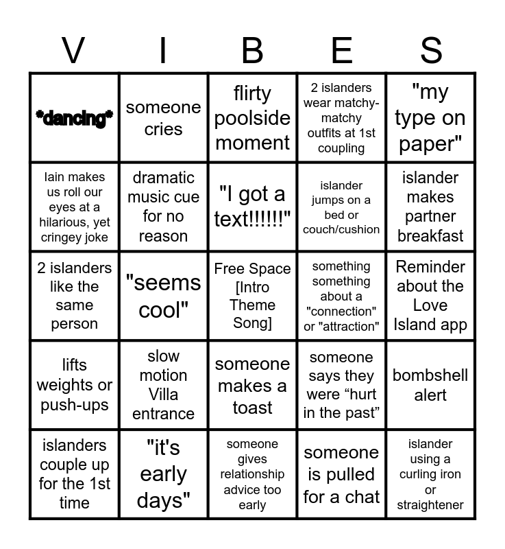 This bingo card has a free space and 24 words: slow motion Villa entrance, "it's early days", "I got a text!!!!!!", islanders couple up for the 1st time, "my type on paper", *dancing*, Iain makes us roll our eyes at a hilarious, yet cringey joke, someone cries, something something about a "connection" or "attraction", someone makes a toast, islander jumps on a bed or couch/cushion, 2 islanders like the same person, someone says they were “hurt in the past”, bombshell alert, dramatic music cue for no reason, someone is pulled for a chat, Reminder about the Love Island app, flirty poolside moment, islander makes partner breakfast, "seems cool", islander using a curling iron or straightener, lifts weights or push-ups, 2 islanders wear matchy-matchy outfits at 1st coupling and someone gives relationship advice too early.