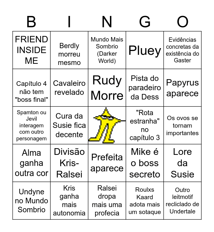 This bingo card has a free space and 24 words: Divisão Kris-Ralsei, Kris ganha mais autonomia, Rudy Morre, Undyne no Mundo Sombrio, Evidências concretas da existência do Gaster, FRIEND INSIDE ME, Capítulo 4 não tem "boss final", Berdly morreu mesmo, "Rota estranha" no capítulo 3, Prefeita aparece, Pista do paradeiro da Dess, Spamton ou Jevil interagem com outro personagem, Mike é o boss secreto, Lore da Susie, Cavaleiro revelado, Roulxs Kaard adota mais um sotaque, Os ovos se tornam importantes, Mundo Mais Sombrio (Darker World), Papyrus aparece, Cura da Susie fica decente, Outro leitmotif recliclado de Undertale, Alma ganha outra cor, Pluey and Ralsei dropa mais uma profecia.