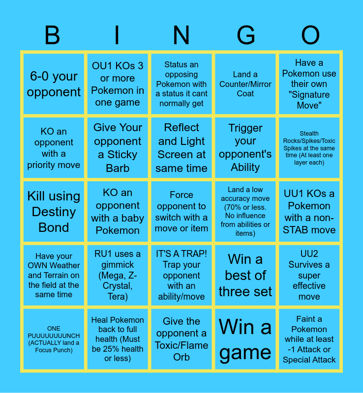 This bingo card has 25 words: RU1 uses a gimmick (Mega, Z-Crystal, Tera), Give the opponent a Toxic/Flame Orb, Reflect and Light Screen at same time, ONE PUUUUUUUUNCH (ACTUALLY land a Focus Punch), Have a Pokemon use their own "Signature Move", 6-0 your opponent, KO an opponent with a priority move, OU1 KOs 3 or more Pokemon in one game, Land a low accuracy move (70% or less. No influence from abilities or items), IT'S A TRAP! Trap your opponent with an ability/move, Trigger your opponent's Ability, Kill using Destiny Bond, Win a best of three set, UU2 Survives a super effective move, Give Your opponent a Sticky Barb, Faint a Pokemon while at least -1 Attack or Special Attack, UU1 KOs a Pokemon with a non-STAB move, Status an opposing Pokemon with a status it cant normally get, Stealth Rocks/Spikes/Toxic Spikes at the same time (At least one layer each), KO an opponent with a baby Pokemon, Force opponent to switch with a move or item, Heal Pokemon back to full health (Must be 25% health or less), Have your OWN Weather and Terrain on the field at the same time, Land a Counter/Mirror Coat and Win a game.