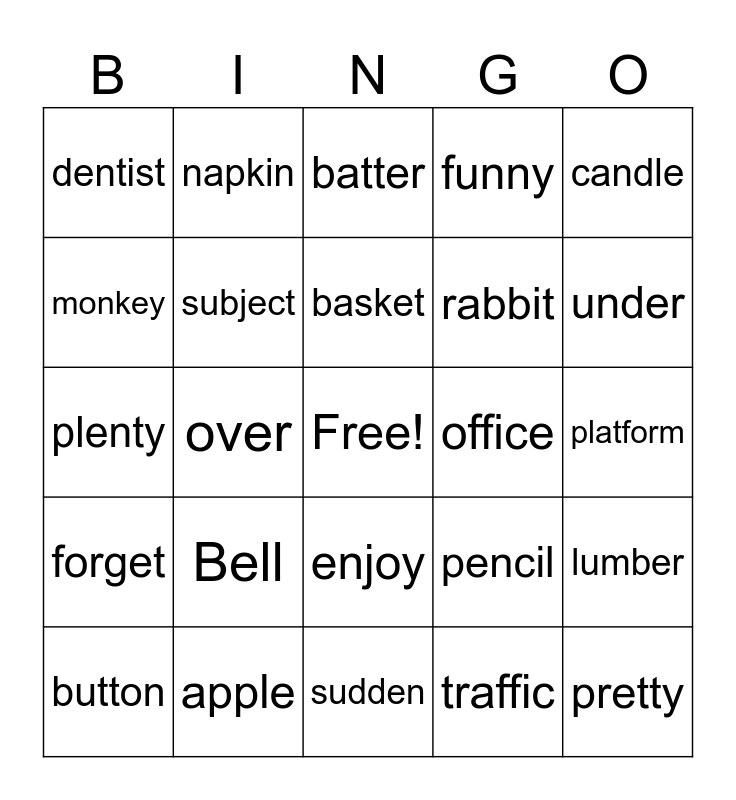 This bingo card has a free space and 24 words: Bell, apple, basket, button, candle, dentist, monkey, napkin, office, enjoy, rabbit, plenty, pencil, lumber, subject, traffic, platform, batter, under, over, pretty, forget, funny and sudden.