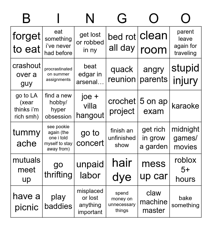 This bingo card has 36 words: hair dye, unpaid labor, spend money on unnecessary things, crashout over a guy, tummy ache, crochet project, procrastinated on summer assignments, misplaced or lost anything important, clean room, mess up car, stupid injury, bed rot all day, roblox 5+ hours, find a new hobby/ hyper obsession, quack reunion, forget to eat, mutuals meet up, 5 on ap exam, go to LA (xear thinks i’m rich smh), get lost or robbed in ny, joe + villa hangout, see pookie again (the one i told myself to stay away from), finish an unfinished show, go to concert, get rich in grow a garden, eat something i’ve never had before, angry parents, play baddies, beat edgar in arsenal…, parent leave again for traveling, bake something, have a picnic, midnight games/ movies, karaoke, go thrifting and claw machine master.
