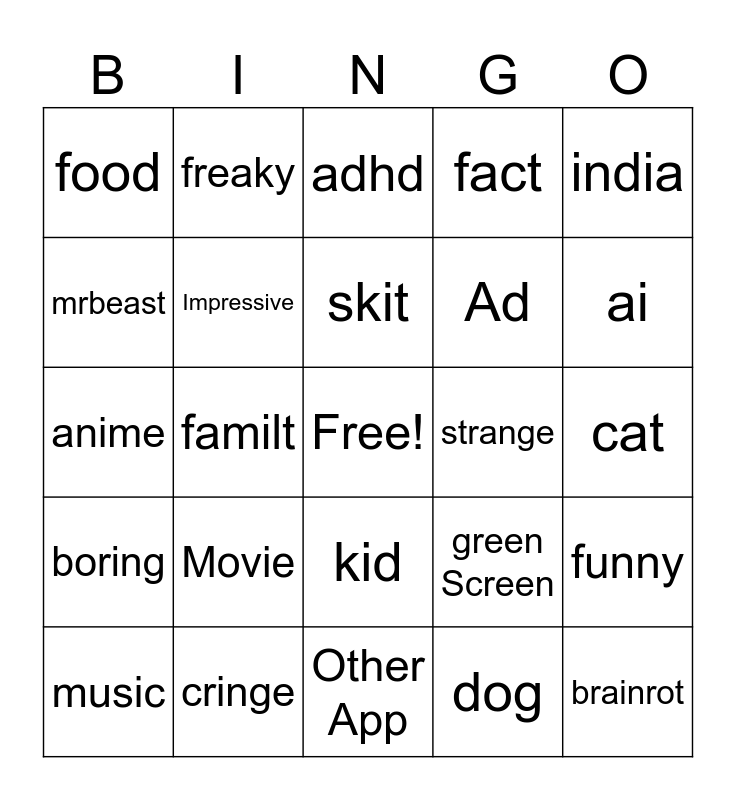 This bingo card has a free space and 24 words: Movie, cringe, skit, music, india, food, mrbeast, freaky, strange, kid, Ad, anime, green Screen, funny, Impressive, dog, cat, adhd, ai, familt, brainrot, boring, fact and Other App.