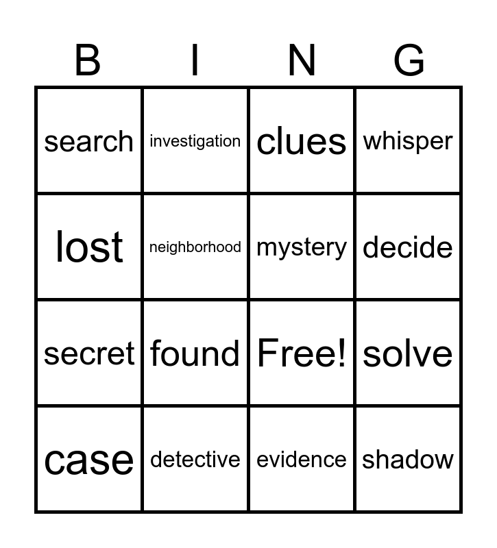 This bingo card has 21 words: detective, undercover, investigation, suspect, evidence, mystery, search, clues, Free!, decide, secret, whisper, shadow, follow, neighborhood, hiding, case, found, lost, solve and tracks.