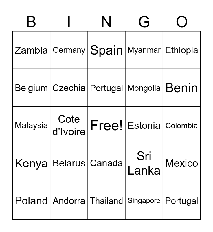This bingo card has a free space and 87 words: United Kingdom, United States, Canada, Australia, New Zealand, France, Canada, Iraq, Egypt, Saudi Arabia, Sudan, Spain, Mexico, Colombia, Argentina, Portugal, Brazil, Germany, Austria, Switzerland, Belgium, Italy, Malaysia, Russia, Singapore, Taiwan, China, Afghanistan, Albania, Algeria, Andorra, Angola, Barbados, Belarus, Belgium, Belize, Benin, Bhutan, Costa Rica, Cote d'Ivoire, Croatia, Cuba, Cyprus, Estonia, Eswatini, Ethiopia, Georgia, Germany, Ghana, Greece, Grenada, Kazakhstan, Kenya, Liechtenstein, Lithuania, Luxembourg, Mongolia, Morocco, Mozambique, Myanmar, Czechia, Netherlands, New Zealand, Nicaragua, Paraguay, Peru, Philippines, Poland, Portugal, South Africa, South Korea, South Sudan, Spain, Sri Lanka, Taiwan, Tajikistan, Tanzania, Thailand, Uruguay, Uzbekistan, Uganda, Ukraine, Venezuela, Vietnam, Yemen, Zambia and Zimbabwe.