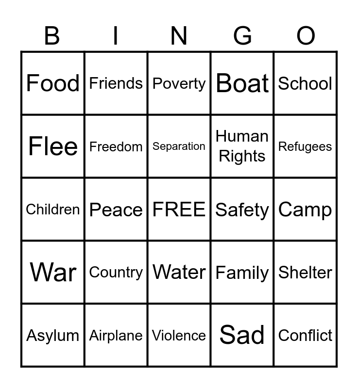 This bingo card has a free space and 24 words: Asylum, Country, Separation, Sad, School, Food, Friends, Poverty, Safety, Camp, Children, Freedom, Family, Shelter, Flee, Airplane, Violence, Boat, Refugees, War, Peace, Water, Human Rights and Conflict.
