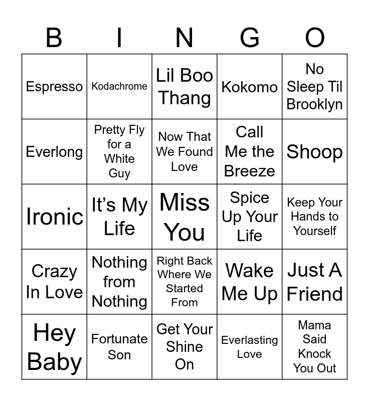 This bingo card has 41 words: Free!, Ironic, What’s Luv?, Pretty Fly for a White Guy, Fortunate Son, Right Back Where We Started From, Now That We Found Love, Abracadabra, No Sleep Til Brooklyn, Crazy In Love, It’s My Life, Kokomo, Miss You, Keep Your Hands to Yourself, Spice Up Your Life, Nothing from Nothing, Pink Pony Club, Espresso, Too Sweet, Lil Boo Thang, Just A Friend, Mama Said Knock You Out, Get Your Shine On, Call Me the Breeze, Ring of Fire, Ain’t No Love in Oklahoma, Everlasting Love, Call Me, Shoop, Under the Bridge, Somebody to Love, Kodachrome, Hey Baby, Best Day of My Life, Wake Me Up, Everlong, Honey, I’m Good, That’s What I Like, This Is What You Came For, My House and These Boots Are Made for Walkin.