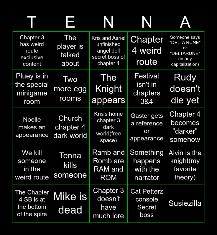 This bingo card has a free space and 24 words: Tenna kills someone, Mike is dead, The Knight appears, The Chapter 4 SB is at the bottom of the spire, Someone says "DELTA RUNE" or "DELTARUNE"(in any capitalization), Chapter 3 has weird route exclusive content, Pluey is in the special minigame room, The player is talked about, Gaster gets a reference or appearance, Ramb and Romb are RAM and ROM, Festival isn't in chapters 3&4, Noelle makes an appearance, Something happens with the narrator, Alvin is the knight(my favorite theory), Two more egg rooms, Cat Petterz console Secret boss, Chapter 4 becomes "darker" somehow, Kris and Asriel unfinished angel doll secret boss of chapter 4, Rudy doesn't die yet, Church chapter 4 dark world, Susiezilla, We kill someone in the weird route, Chapter 4 weird route and Chapter 3 doesn't have much lore.