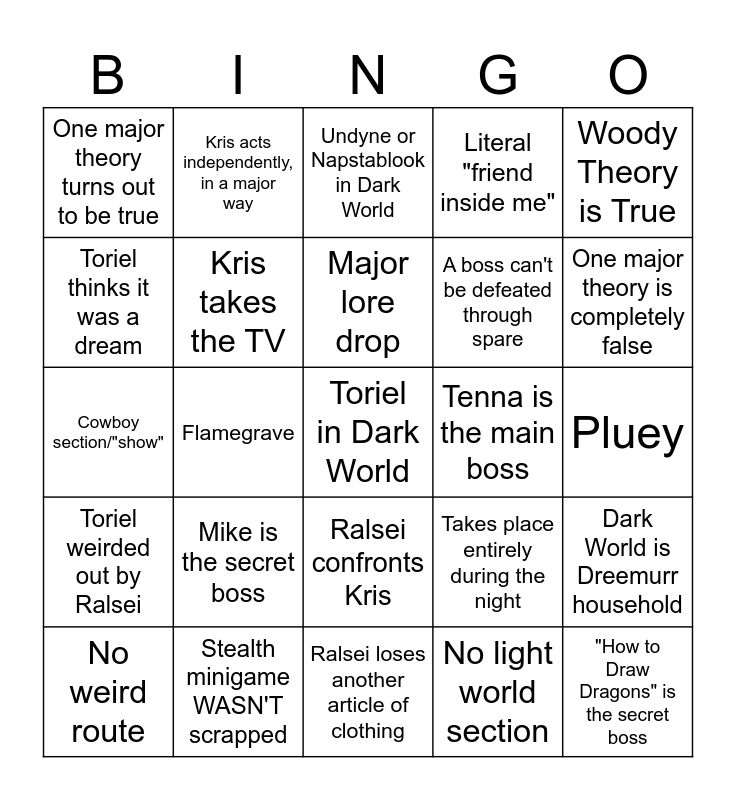This bingo card has a free space and 24 words: Mike is the secret boss, Stealth minigame WASN'T scrapped, Major lore drop, No weird route, Woody Theory is True, One major theory turns out to be true, Toriel thinks it was a dream, Kris acts independently, in a major way, Tenna is the main boss, Ralsei confronts Kris, A boss can't be defeated through spare, Cowboy section/"show", Takes place entirely during the night, Dark World is Dreemurr household, Kris takes the TV, No light world section, Pluey, Undyne or Napstablook in Dark World, One major theory is completely false, Flamegrave, "How to Draw Dragons" is the secret boss, Toriel weirded out by Ralsei, Literal "friend inside me" and Ralsei loses another article of clothing.