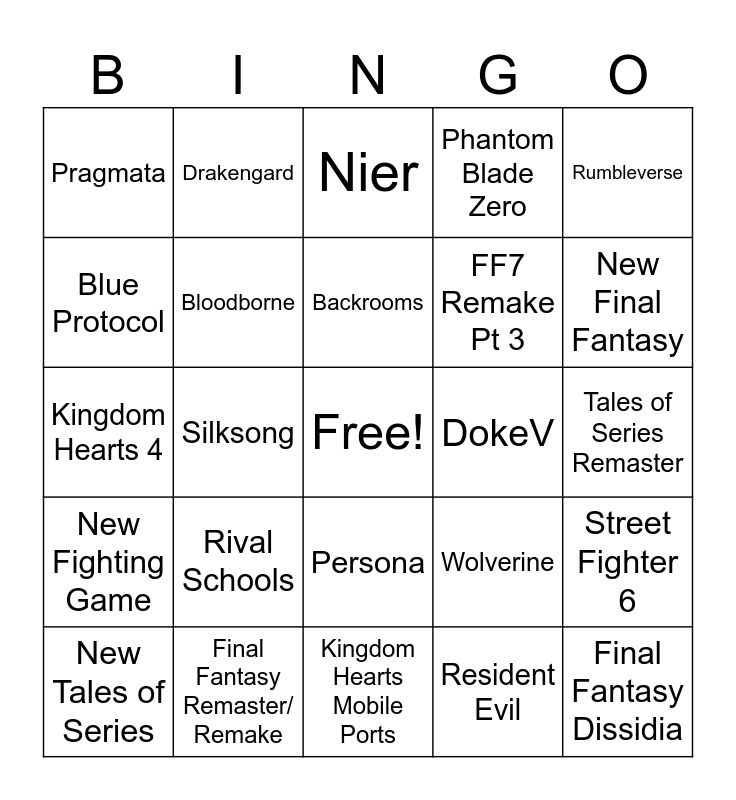 This bingo card has a free space and 24 words: Rival Schools, Final Fantasy Remaster/ Remake, Backrooms, New Tales of Series, Rumbleverse, Pragmata, Blue Protocol, Drakengard, DokeV, Persona, FF7 Remake Pt 3, Kingdom Hearts 4, Wolverine, Street Fighter 6, Bloodborne, Resident Evil, Tales of Series Remaster, Nier, New Final Fantasy, Silksong, Final Fantasy Dissidia, New Fighting Game, Phantom Blade Zero and Kingdom Hearts Mobile Ports.