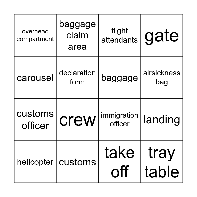 This bingo card has 25 words: cockpit, airline terminal, airsickness bag, check-in counter, carousel, overhead compartment, declaration form, baggage claim area, customs, oxygen masks, customs officer, immigration officer, boarding area, pilot, baggage, control tower, take off, flight attendants, crew, landing, helicopter, luggage carrier, tray table, gate and arrival/departure monitors.