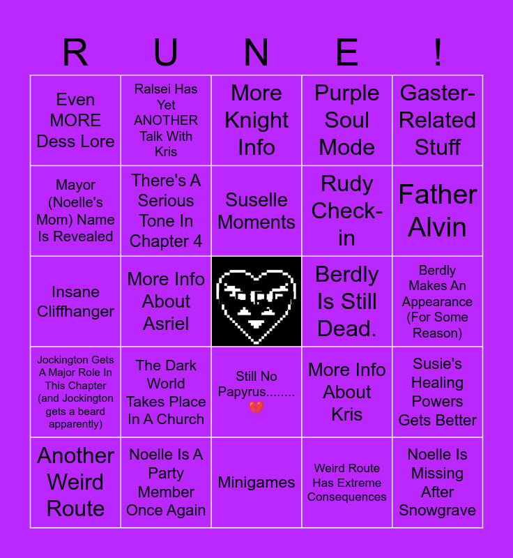 This bingo card has a free space and 24 words: The Dark World Takes Place In A Church, Noelle Is A Party Member Once Again, Suselle Moments, Another Weird Route, Gaster-Related Stuff, Even MORE Dess Lore, Mayor (Noelle's Mom) Name Is Revealed, Ralsei Has Yet ANOTHER Talk With Kris, Berdly Is Still Dead., Still No Papyrus........💔, Rudy Check-in, Insane Cliffhanger, More Info About Kris, Susie's Healing Powers Gets Better, There's A Serious Tone In Chapter 4, Weird Route Has Extreme Consequences, Berdly Makes An Appearance (For Some Reason), More Knight Info, Father Alvin, More Info About Asriel, Noelle Is Missing After Snowgrave, Jockington Gets A Major Role In This Chapter (and Jockington gets a beard apparently), Purple Soul Mode and Minigames.
