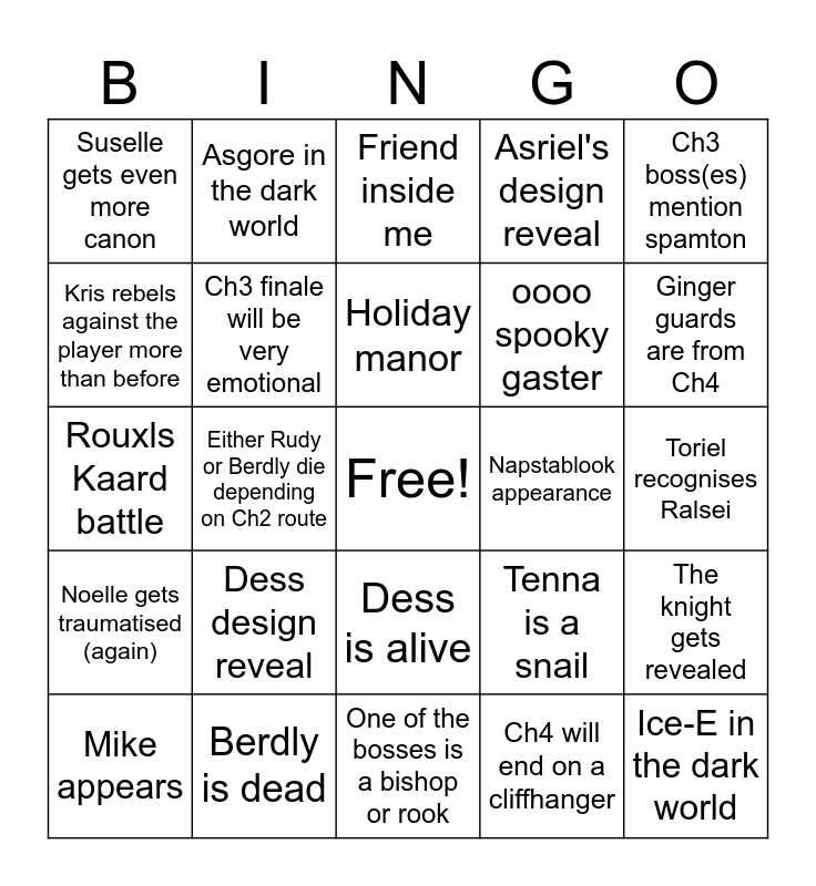 This bingo card has a free space and 24 words: Dess design reveal, Berdly is dead, Holiday manor, Mike appears, Ch3 boss(es) mention spamton, Suselle gets even more canon, Kris rebels against the player more than before, Asgore in the dark world, Napstablook appearance, Dess is alive, oooo spooky gaster, Rouxls Kaard battle, Tenna is a snail, The knight gets revealed, Ch3 finale will be very emotional, Ch4 will end on a cliffhanger, Toriel recognises Ralsei, Friend inside me, Ginger guards are from Ch4, Either Rudy or Berdly die depending on Ch2 route, Ice-E in the dark world, Noelle gets traumatised (again), Asriel's design reveal and One of the bosses is a bishop or rook.