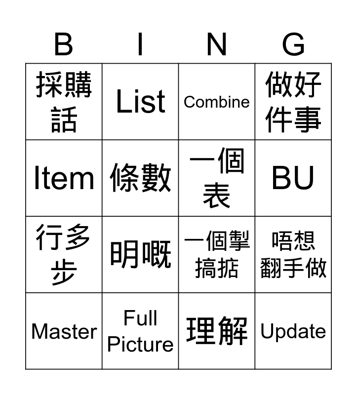 This bingo card has 16 words: Full Picture, 唔想 翻手做, Combine, 採購話, 行多步, List, 一個掣搞掂, 理解, Item, 條數, Master, 做好 件事, 明嘅, BU, 一個表 and Update.