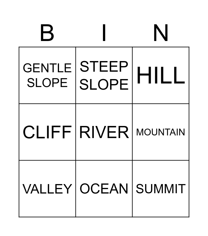 This bingo card has a free space and 8 words: MOUNTAIN, HILL, STEEP SLOPE, VALLEY, GENTLE SLOPE, SUMMIT, CLIFF and OCEAN.