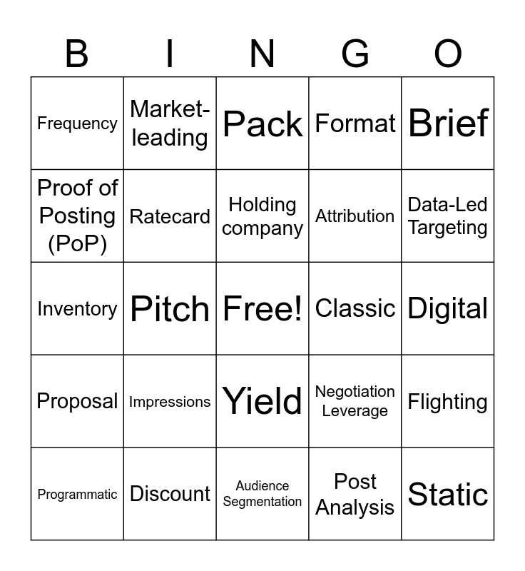 This bingo card has a free space and 40 words: CPM, Inventory, Avails, Ratecard, Discount, Yield, Holding company, Agency, Brief, Proposal, Pitch, Format, Static, Digital, Classic, Impressions, Reach, Frequency, Share of Voice (SOV), Pack, Flighting, Post Analysis, Attribution, Proof of Posting (PoP), Skin, Go Live, Upweight, Roadside Large Format, Coverage, Incremental, Network Buy, Programmatic, Trading Desk, Negotiation Leverage, Data-Led Targeting, Audience Segmentation, Big Idea, Best-in-class, Market-leading and Award-winning.