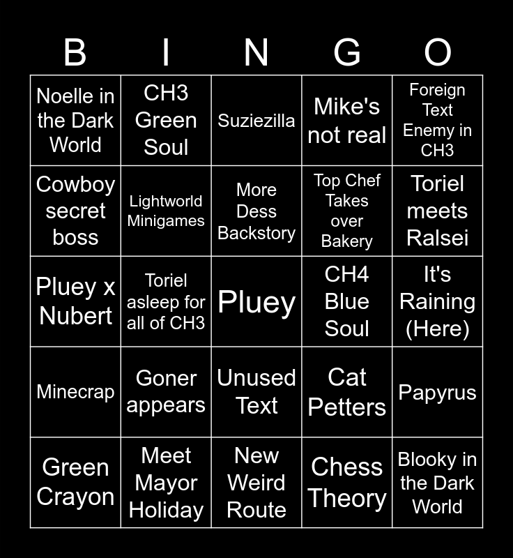 This bingo card has a free space and 24 words: Goner appears, Meet Mayor Holiday, More Dess Backstory, Green Crayon, Foreign Text Enemy in CH3, Noelle in the Dark World, Cowboy secret boss, CH3 Green Soul, CH4 Blue Soul, Unused Text, Top Chef Takes over Bakery, Pluey x Nubert, Cat Petters, Papyrus, Lightworld Minigames, Chess Theory, It's Raining (Here), Suziezilla, Toriel meets Ralsei, Toriel asleep for all of CH3, Blooky in the Dark World, Minecrap, Mike's not real and New Weird Route.