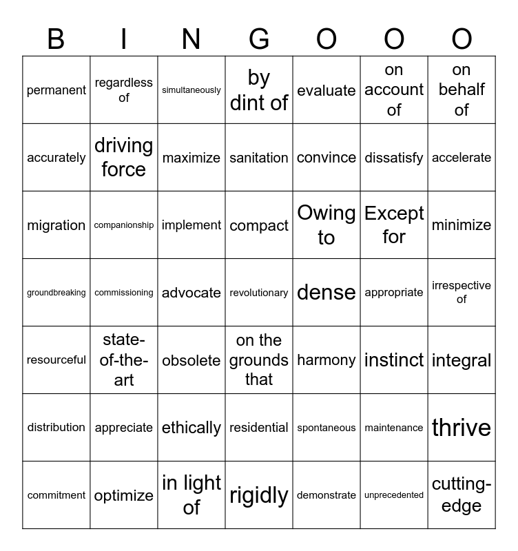 This bingo card has 49 words: maintenance, dissatisfy, demonstrate, commissioning, implement, irrespective of, regardless of, in light of, on account of, on the grounds that, on behalf of, by dint of, Except for, Owing to, appreciate, appropriate, accurately, accelerate, thrive, evaluate, convince, advocate, permanent, driving force, commitment, maximize, minimize, optimize, compact, companionship, cutting-edge, dense, distribution, ethically, groundbreaking, harmony, instinct, integral, migration, obsolete, residential, resourceful, revolutionary, rigidly, sanitation, simultaneously, spontaneous, state-of-the-art and unprecedented.