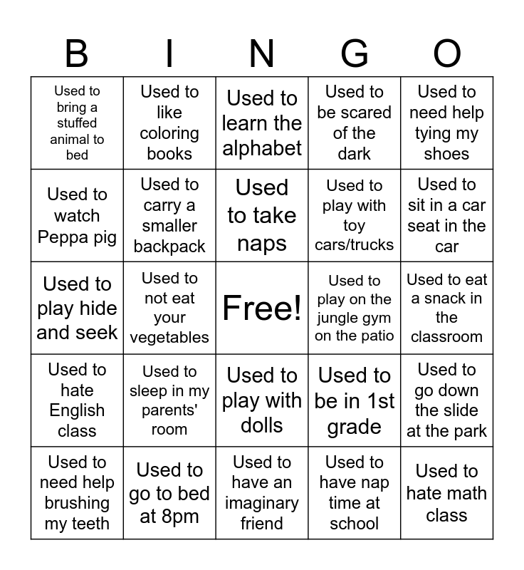 This bingo card has a free space and 24 words: Used to sleep in my parents' room, Used to go to bed at 8pm, Used to take naps, Used to need help brushing my teeth, Used to need help tying my shoes, Used to bring a stuffed animal to bed, Used to watch Peppa pig, Used to like coloring books, Used to play on the jungle gym on the patio, Used to play with dolls, Used to play with toy cars/trucks, Used to play hide and seek, Used to be in 1st grade, Used to go down the slide at the park, Used to carry a smaller backpack, Used to have nap time at school, Used to eat a snack in the classroom, Used to learn the alphabet, Used to sit in a car seat in the car, Used to not eat your vegetables, Used to hate math class, Used to hate English class, Used to be scared of the dark and Used to have an imaginary friend.