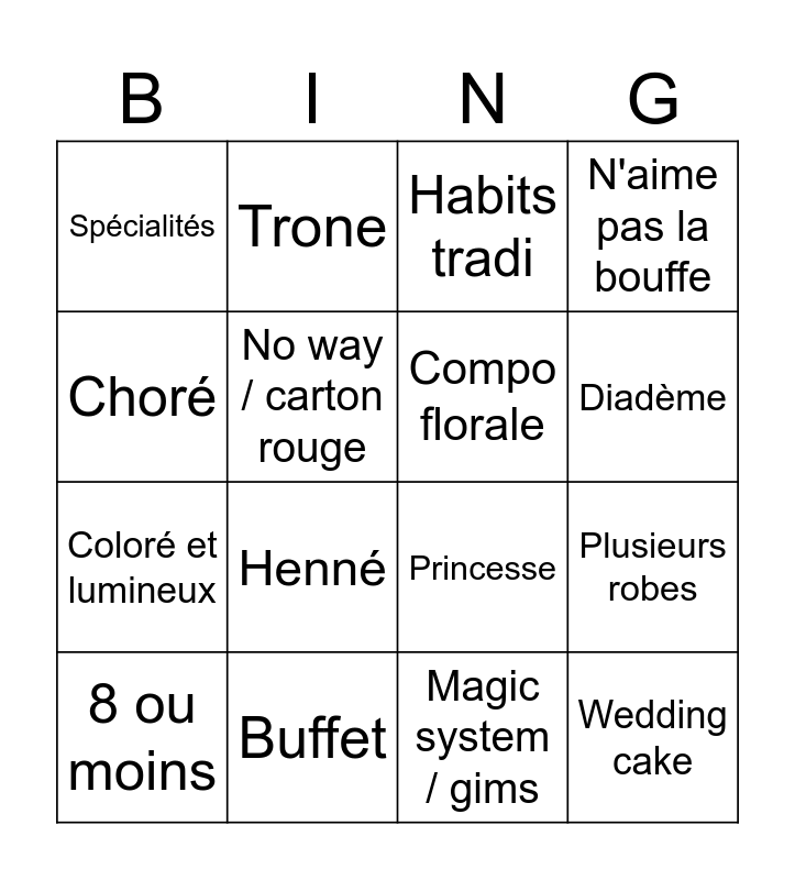 This bingo card has 16 words: Buffet, Plusieurs robes, Habits tradi, Spécialités, Coloré et lumineux, Trone, Princesse, Magic system / gims, Choré, No way / carton rouge, 8 ou moins, N'aime pas la bouffe, Henné, Diadème, Compo florale and Wedding cake.