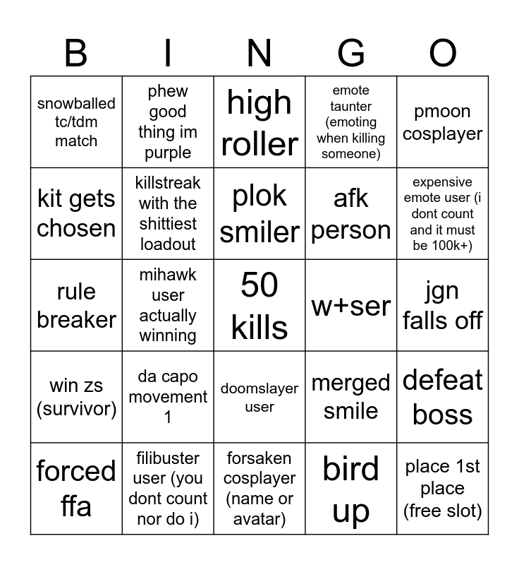 This bingo card has a free space and 24 words: da capo movement 1, filibuster user (you dont count nor do i), plok smiler, forced ffa, pmoon cosplayer, snowballed tc/tdm match, kit gets chosen, phew good thing im purple, w+ser, doomslayer user, afk person, rule breaker, merged smile, defeat boss, killstreak with the shittiest loadout, bird up, jgn falls off, high roller, expensive emote user (i dont count and it must be 100k+), mihawk user actually winning, place 1st place (free slot), win zs (survivor), emote taunter (emoting when killing someone) and forsaken cosplayer (name or avatar).