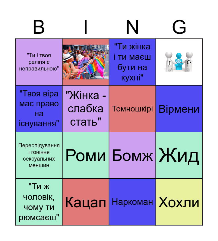 This bingo card has 2 images and 14 words: Кацап, Жид, "Ти жінка і ти маєш бути на кухні", "Ти і твоя релігія є неправильною", Переслідування і гоніння сексуальних меншин, Бомж, Наркоман, "Твоя віра має право на існування", "Жінка - слабка стать", "Ти ж чоловік, чому ти рюмсаєш", Роми, Вірмени, Темношкірі and Хохли.
