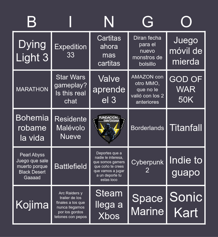This bingo card has a free space and 24 words: Battlefield, Arc Raiders y trailer de los finales a los que nunca llegamos por los gordos tetones con pepos, Valve aprende el 3, Kojima, Juego móvil de mierda, Dying Light 3, MARATHON, Expedition 33, Borderlands, Deportes que a nadie le interesa, que somos gamers que coño te crees que vamos a jugar a un deporte tu estas loco, AMAZON con otro MMO, que no le valió con los 2 anteriores, Bohemia robame la vida, Cyberpunk 2, Indie to guapo, Star Wars gameplay? Is this real chat, Space Marine, Titanfall, Cartitas ahora mas cartitas, GOD OF WAR 50K, Residente Malévolo Nueve, Sonic Kart, Pearl Abyss Juego que sale muerto porque Black Desert Gaaaad, Diran fecha para el nuevo monstros de bolsillo and Steam llega a Xbos.